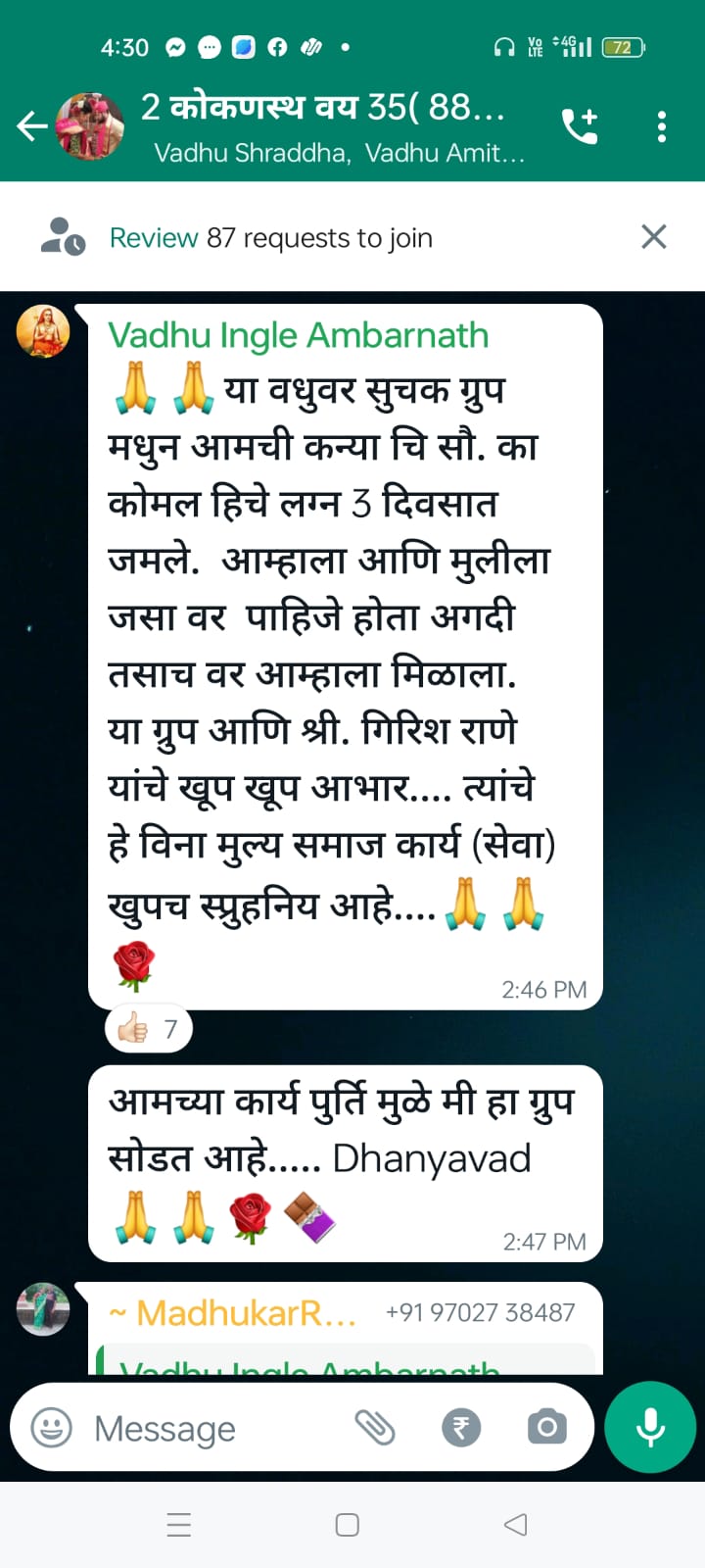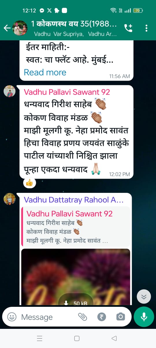 Our exclusive Kokan Connect WhatsApp group has not only been a bridge for numerous successful matches but has also garnered heartfelt testimonials, as evidenced in the images. These stories are a testament to our unwavering commitment to creating meaningful connections.